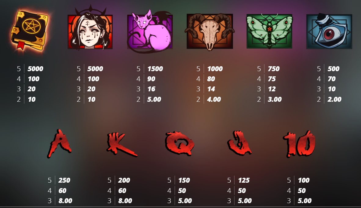 Book Of Shadows Ödeme  başlıklı bölümümüzde slot çevirme işleminde sembollerin yan yana gelmesi durumunda sağlayabileceğiniz kazanc ödeme tablosunu sunduk.