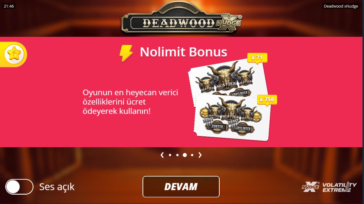 Dead wood nasıl oynanır başlıklı bölümümüzde en çok oynanan slot oyunları arasında yer alan dead wood oyununu incelemeye devam edeceğiz. Dead wood vahşi bati temalı one limit city casino markasının bonus oyunu satın alınabilen slot oyunlarından bir tanesidir. Semboller stilize edilmiş A, K, Q, J ve 10 kraliyet içerir. Ayrıca av tüfekleri, viski şişeleri, para kasaları, altın cep saatleri ve külçe altın külçeleri de göreceksiniz. Külçe altın barlar sembolü, en yüksek değerdir birlikte 0.25, 0.75 ya da 3 için 3.75 x hissesini, 4 veya 5 öder. Arka planda tozlu bir Batı sokağı varken, kötü şöhretli Deadwood kasabasına gidiyorsunuz . Bu temaya sahip bir slot oyunundan beklediğiniz şey budur. Ekranda herhangi bir yere tıklarsanız, oldukça hoş bir dokunuş olan kurşun delikleri belirir.